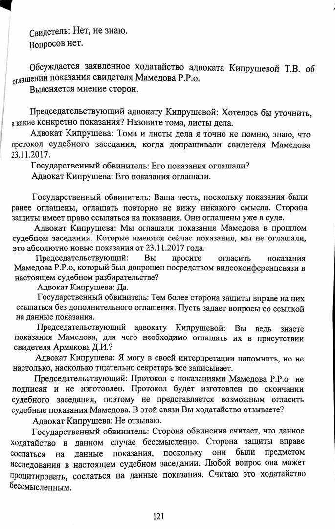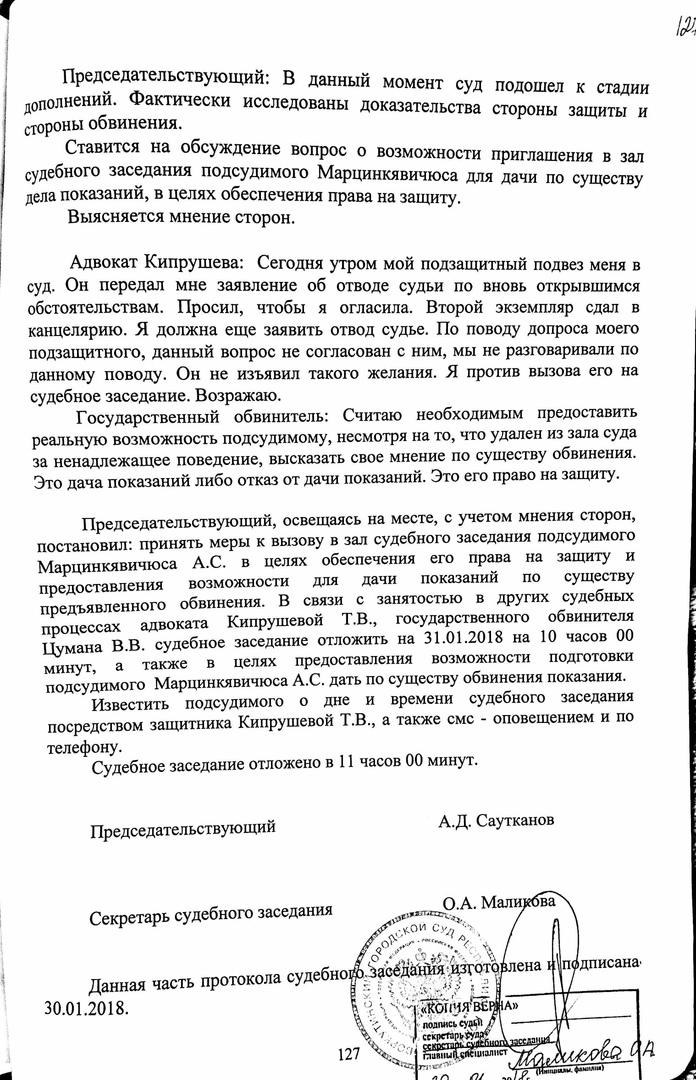 «После заслушивания речи гособвинителя подсудимым был задан вопрос, признают они себя виновными или нет. Александр Сердитов заявил, что признает вину полностью по всем статьям. На предложение суда выразить свое отношение к предъявленному обвинению Сердитов ответил: