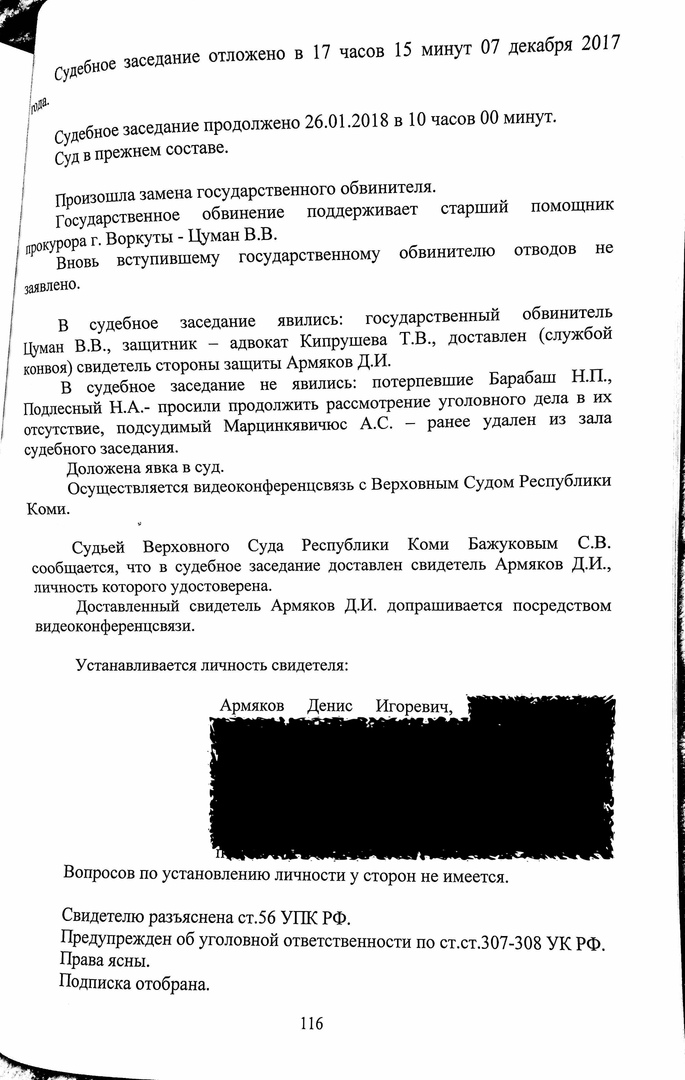 Как бы то ни было, в город Воркуту выезжает следственная бригада, не посвящая местных сотрудников милиции в детали, устанавливает прослушку в квартиры подозреваемых, т.е. ведёт розыскные мероприятия. Излишняя откровенность в домашних беседах дала зацепку для следствия. Гражданка Барабаш призналась в совершении преступления. В показаниях прозвучала фамилия Мамедова Р.Р.о., как одного из соучастников убийства.