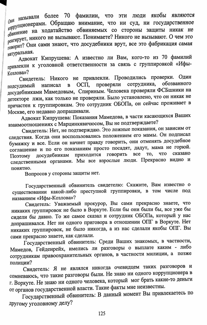Возьмём нашумевшее дело ОПГ «Ифы-Козлова». 20 лет в Воркуте существовала организованная группа лиц, которые держали в страхе весь город. Никто из правоохранителей не только не замечал творящегося безпредела, многие из состава руководства (не говоря уже о рядовых сотрудниках) являлись активными помощниками и участниками этой группировки. Включая прокуратуру, суды, ОБОП и др. Очень тесные связи установились и с властью. Ниточка тянется через мэров к Республиканскому руководству, а там, видимо, и выше! К подробностям и конкретным деталям мы ещё перейдём, а пока опишем, как возбуждали дело.