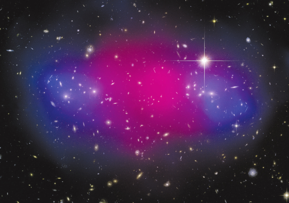 Для тех, кто все-таки сомневается в существовании темной материи, — картинка, где она «видна глазами» (рис. 1). Это снимок «Хаббла» двух скоплений галактик, пролетевших одно сквозь другое, с наложением поверх этого карты распределения горячего газа от рентгеновского телескопа «Чандра» (розовый цвет) и карты распределения массы по результатам гравитационного линзирования далеких галактик (синий цвет). Где находится основная масса обычного (барионного) вещества скопления? Не в звездах, а в газе (по крайней мере, его доля в пять раз больше звезд). Масса газа оценивается по интенсивности рентгеновского излучения — чем она выше, тем чаще сталкиваются частицы. Газ горячий, поэтому он прекрасно виден в рентгене.