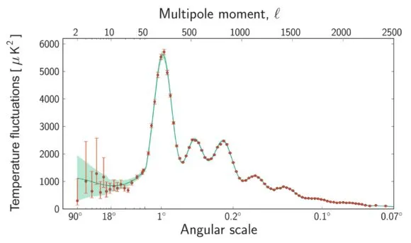 Темная материя и обычное вещество влияют на температуру реликтового излучения существенно по-разному. Для обычного вещества основной эффект — это неоднородность горячей среды, проявляющаяся в звуковых колебаниях космической плазмы. В русскоязычной литературе их нередко называют «сахаровскими осцилляциями», а в англоязычной литературе — «акустическими осцилляциями»1. Эти колебания прекрасно видны в данных по реликтовому излучению — там, где плотность горячей среды выше, там и температура выше. Для темной материи такого явления нет: температура 3000 K к ней отношения не имеет, темная материя — холодная (или «прохладная»). Строго говоря, здесь важна не температура, которой мы не знаем (она зависит от массы частиц темной материи), а скорость частиц — она должна быть достаточно малой, чтобы частицы могли скапливаться в гравитационных ямах. И они скапливались, к моменту рекомбинации почти на два порядка увеличив глубину гравитационных ям (там, где плотность выше) или высоту горбов (где плотность ниже). Эти ямы и горбы фактически видны на карте реликтового излучения, хотя и не напрямую, а при определенной обработке. Эта обработка называется «разложением по угловым мультиполям», она отражает зависимость контраста пятен от их размера. Разложение показано на рис. 3. Плавные пики, самый высокий из которых соответствует размеру пятен около градуса, появились благодаря обычному веществу — это и есть упомянутые выше сахаровские осцилляции. Высота этих пиков сильно зависит от концентрации обычной материи — отсюда получается очень точное измерение этой концентрации. А вот «подложку» под этими пиками обычной материей объяснить невозможно — если бы не темная материя, этой «подложки» почти не было бы. Здесь и сказывается темная материя, «стекшаяся» в образованные ею гравитационные ямы. Звуковых волн в темной материи нет (поскольку нет давления), так что вклад темной материи в угловые мультиполи не осциллирует.