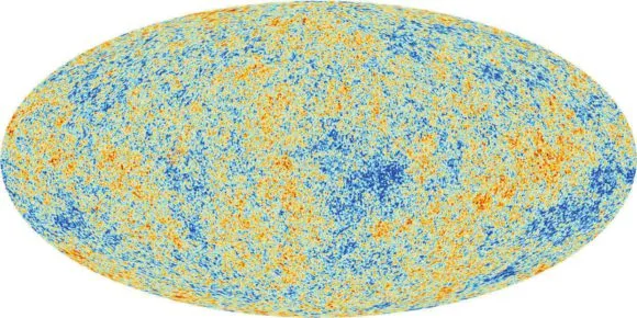 Главное свидетельство присутствия темной материи в ранней Вселенной «вписано» в карту реликтового излучения. Это не единственный, но самый богатый источник космологической информации о темной материи. Реликтовое излучение — микроволновый фон, «остывший свет» горячей плазмы, который перестал взаимодействовать с космической средой тогда, когда Вселенной было всего 380 тыс. лет от роду и в ней царила температура 3000 кельвинов (сейчас тепловой фон упал до 2,7 К). Это время называют эпохой рекомбинации — тогда произошел переход обычного вещества из плазменного (непрозрачного для фотонов) в газообразное (прозрачное) состояние. Вещество в той юной Вселенной было гораздо однороднее, чем сейчас, — никаких галактик, скоплений галактик и пустот (не говоря уж о звездах и планетах) тогда не было, а неоднородности обычного вещества составляли относительную величину порядка 10–5. Эти неоднородности приводят к зависимости температуры реликтового излучения от направления на небесной сфере (анизотропии), с высокой точностью измеренной в многочисленных экспериментах, среди которых на сегодняшний день наиболее информативен, пожалуй, космический эксперимент «Планк». Иными словами, температурная карта Вселенной возраста 380 тыс. лет слегка пятниста (рис. 2). Контраст этой пятнистости лишь немногим выше, чем 10–5, но она несет уйму информации.