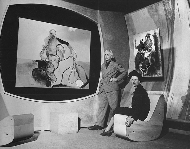 Зал «Искусства этого века» в оформлении Кислера С другой стороны, возможно, проблема вовсе не в оптике Гуггенхайм (размытой при упоминании живописи и куда более отчетливой в описаниях светской жизни), а в нежелании читателя изменить собственный фокус. Ведь на фоне великих современников Гуггенхайм невольно встает с ними в одну шеренгу, и мы ожидаем от нее охвата главных веяний арт-мира с подробной инструкцией — по сути, переделываем ее в другого человека. Так выходит, потому что повествование сбивается, перескакивая на повседневность личной жизни, и любопытному читателю наперекор автору хочется увести камеру в сторону французских мастерских, вылепить из нее теоретика только из-за ее сотрудничества с колоссами модернизма.