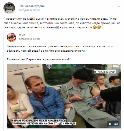 Студентка юридического факультета СПбГУ Анна Довгалюк опубликовала видеоманифест против менспрединга — манеры мужчин широко раздвигать ноги в транспорте. В ролике пассажиров петербургского метро обливают «водой с отбеливателем». В соцсетях ролик назвали постановочным, один из облитых в видео мужчин это подтвердил.