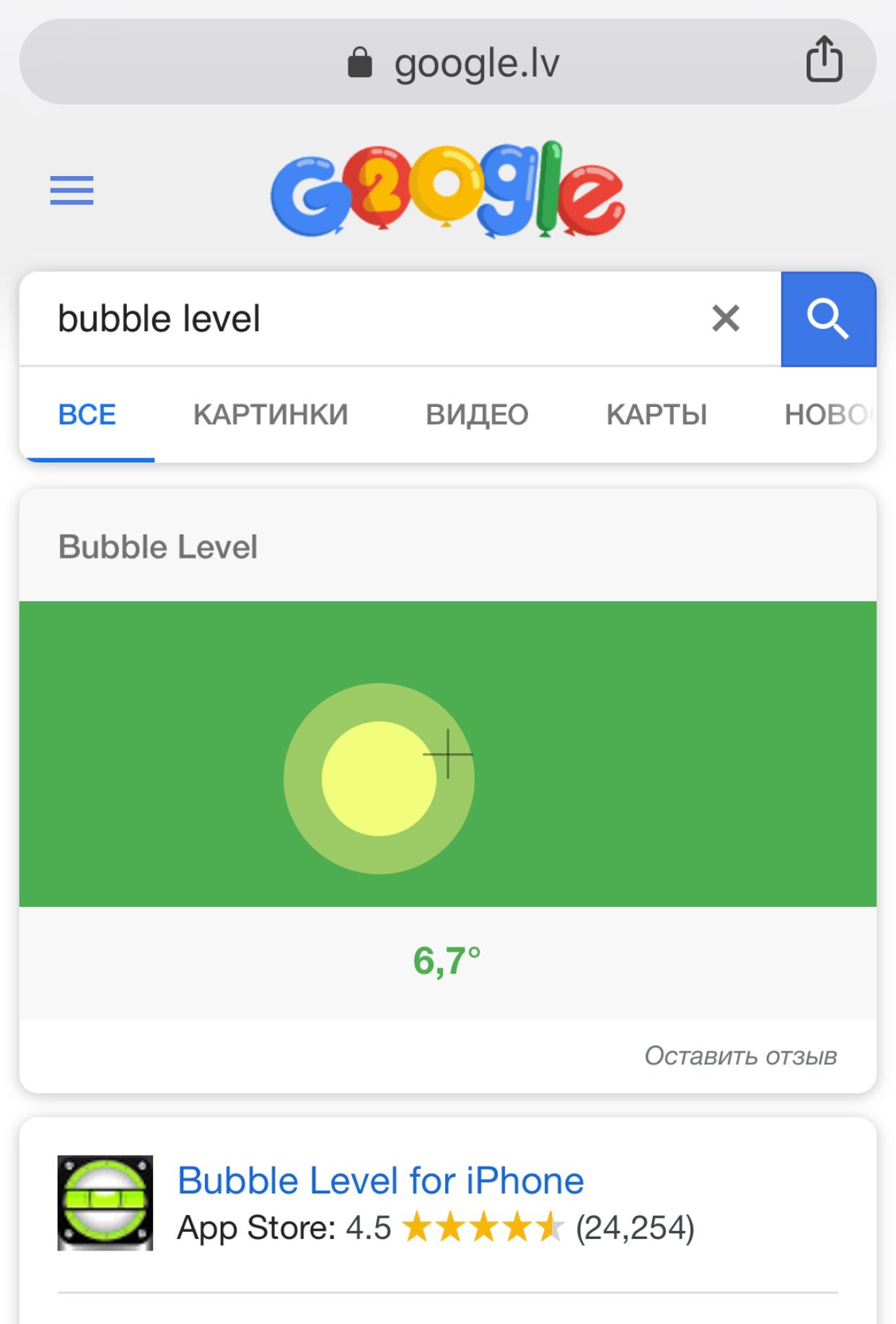В блоге компании появились стихи, в которых рассказывается о таких пасхальных яйцах. Оттуда мы узнали, что запрос «zerg rush» запускает игру про монстров, пожирающих найденные ссылки. А «bubble level» показывает строительный уровень, который анализирует данные с акселерометра — и демонстрирует, как сильно наклонен телефон относительно горизонтальной плоскости.