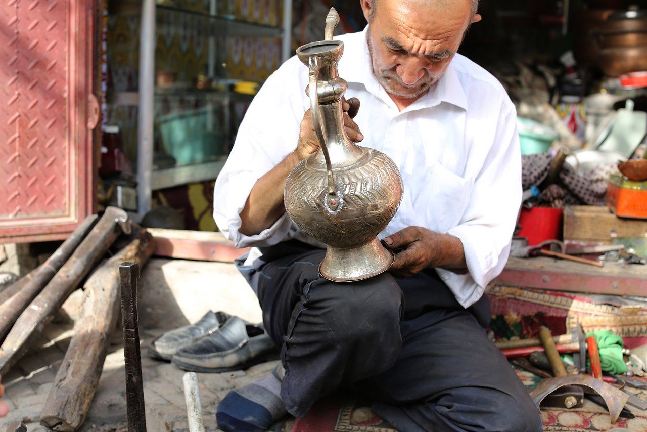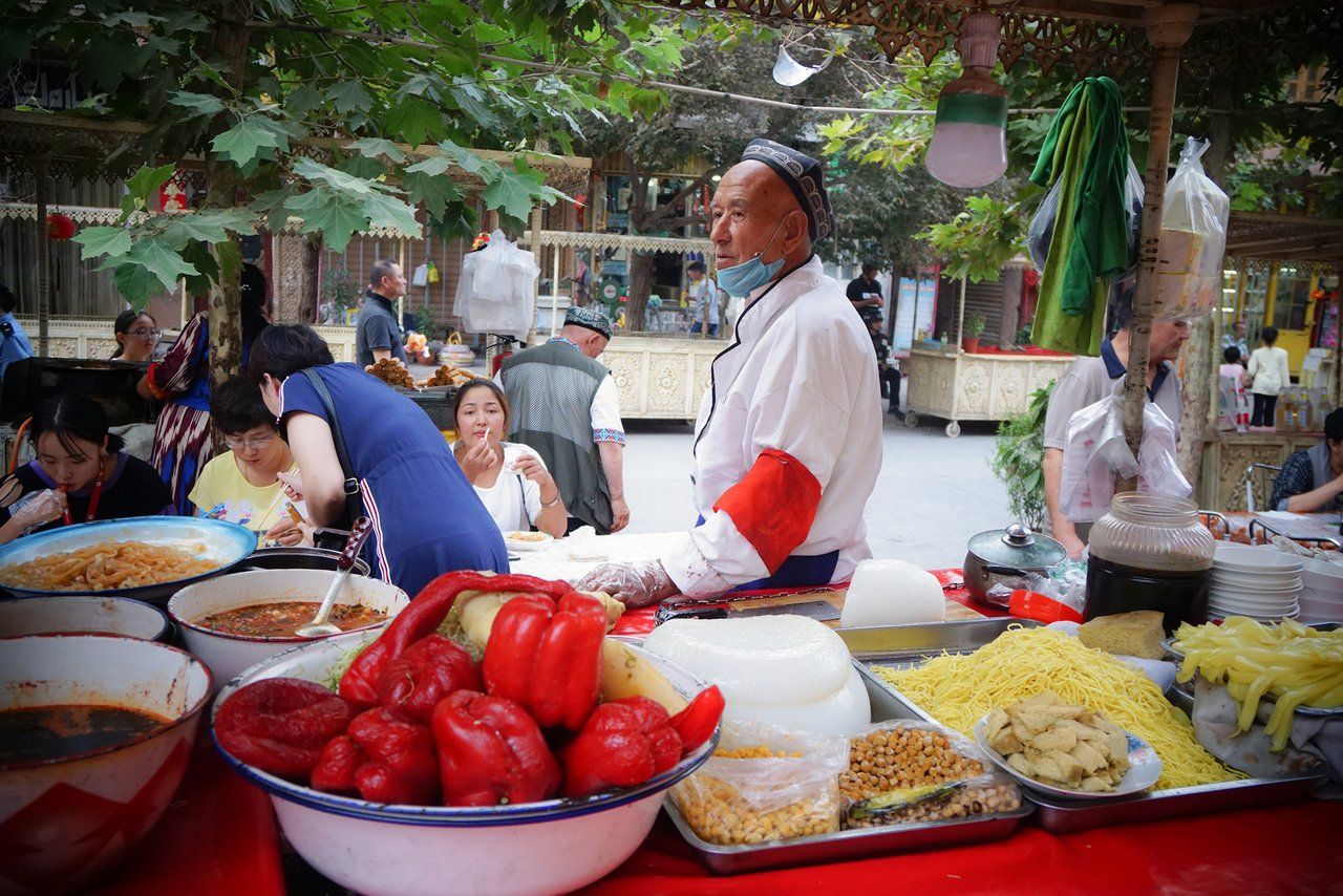 By far the greatest loss has been the disappearance of Kashgar’s old street life. The blacksmiths and the hawkers are all gone, as are the carpenters who would carve vases out of gourds beside the road, the street vendors, and the donkey-pulled carts that played the role of taxis in the city. Old men in skullcaps sit along the flower-lined avenues and decorously drink their tea out of piyālas just as they always have, but they have a lost look about them, and the Chinese tourists taking photographs of them far outnumber the men themselves. At the food market, which has remained in its former location, people still barter for noodles and lamb heads, but the buyers are now all Chinese, and the sleeves of the Uyghur sellers are now graced with yellow text on a red patch testifying to the fact that the wearer has received a government license.
