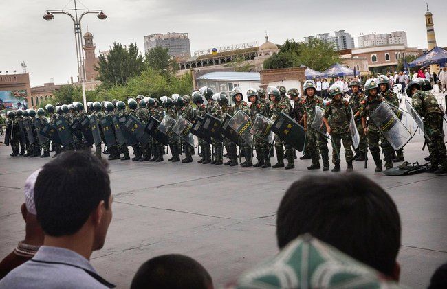 Kevin Frayer / Getty Images Chinese soldiers surround the central mosque of Kashgar after the death of its imam, July 30, 2014