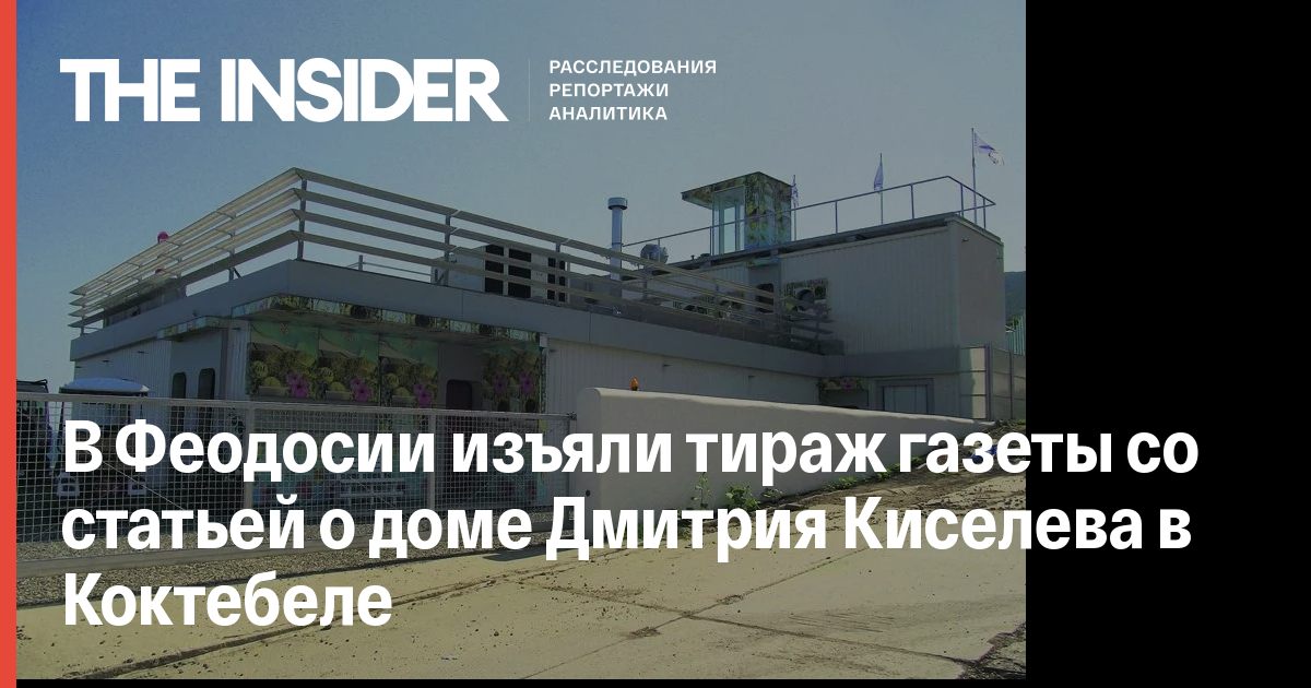 В Феодосии изъяли тираж местной газеты «Город24», опубликовавшей статью о доме гендиректора МИА «Россия сегодня» Дмитрия Киселева в Коктебеле. Об этом сообщает «Новая газета» со ссылкой на автора изъятого материала, Владимира Мазурина.