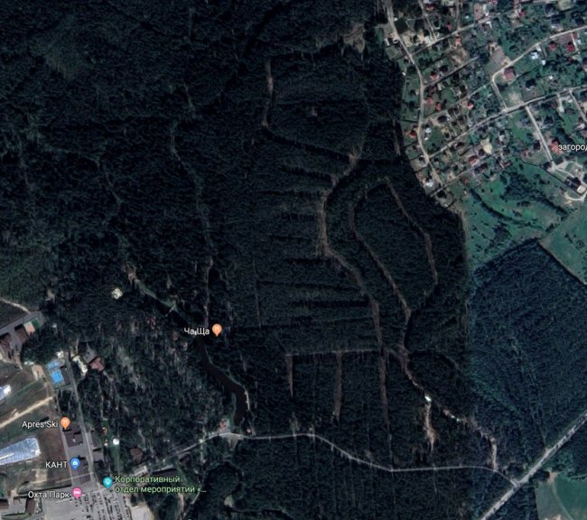 Однако очертания прорубленных просек на космоснимке меньше всего похожи на извилистые тропинки лесопарка. Скорее это ряд параллельных улиц коттеджного поселка с ровными квадратиками под будущие дома. А в марте 2018 года еще одна компания владельцев Охта-парка, ООО «Росинжиниринг-энерго-строй», анонсировала, что коттеджный поселок премиум-класса «Образ жизни» разместится «посреди живописного хвойного леса» на территории более 30 га.