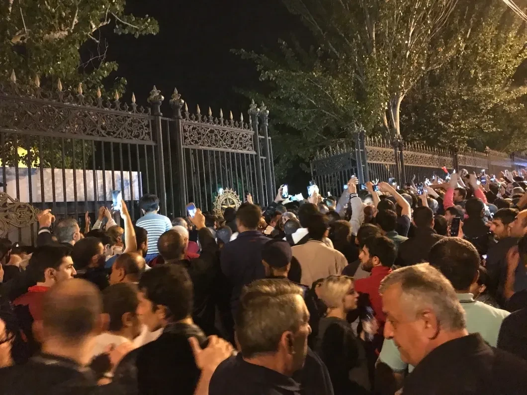 Все время до десяти вечера люди толпились у высокого забора, окружающего парламент. С 1999 года на его территорию просто так попасть нельзя, и такой же запрет действует в отношении многих административных зданий Еревана. Но, например, в День независимости Армении, две недели назад, Пашинян торжественно открыл ворота на территорию своей резиденции (тоже на улице Баграмяна, неподалеку) — «в знак того, что власть в Армении больше не будет изолирована и оторвана от народа».
