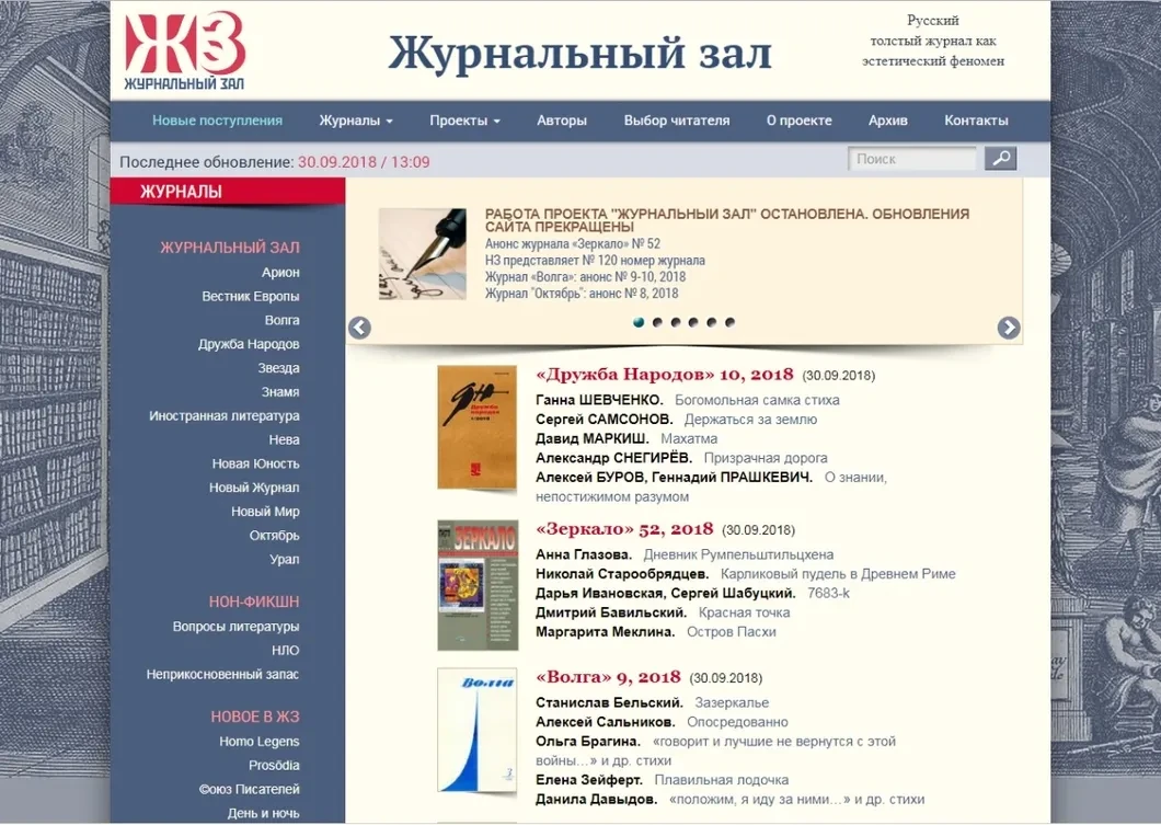 тиражи — результат. Премии — результат. Интервью на телеканалах — тоже. Но помимо результата есть еще литературный процесс, живая история современной литературы, которую 22 года отражал портал «Журнальный зал». Сейчас на его первой странице висит объявление: «Работа проекта остановлена, обновления прекращены». Что же произошло?