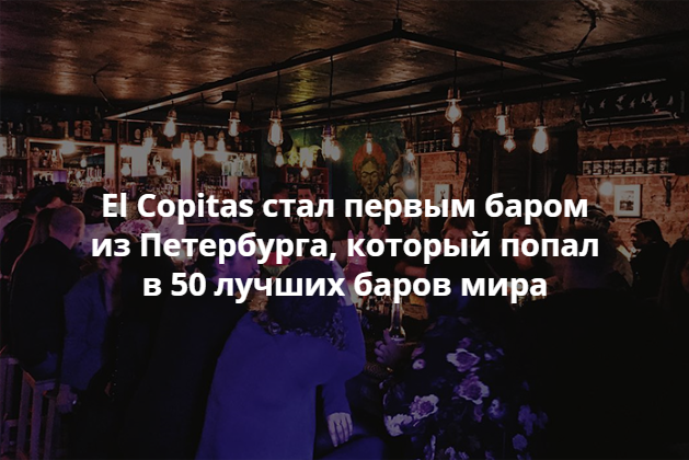 Секретный петербургский бар El Copitas занял 39-е место в списке 50 лучших баров мира и стал первым петербургским заведением в главном рейтинге World’s 50 Best Bars. До этого El Copitas дважды попадал в расширенный список лучших баров.