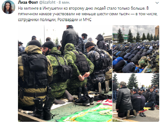 «На митинге в Ингушетии ко второму дню людей стало только больше. В пятничном намазе участвовали не меньше шести-семи тысяч — в том числе, сотрудники полиции, Росгвардии и МЧС», — пишет в Twitter корреспондент Русской службы «Би-би-си» Лиза Фохт.