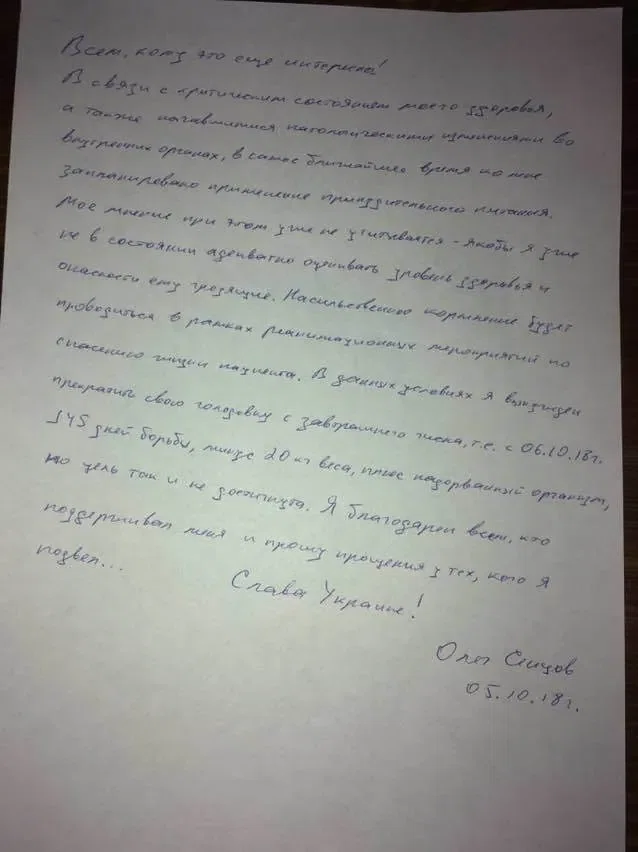 «В связи с критическим состоянием моего здоровья, а также начавшимися патологическими изменениями во внутренних органах, в самое ближайшее время ко мне запланировано применение принудительного питания. Мое мнение при этом уже не учитывается. Якобы я уже не в состоянии адекватно оценивать уровень здоровья и опасности ему грозящей. Насильственное кормление будет проводиться в рамках реанимационных мероприятий по спасению жизни пациента. В данных условиях я вынужден прекратить свою голодовку с завтрашнего дня, то есть с 6.10.18.