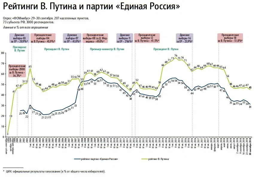 Рейтинг «Единой России», согласно данным опроса ФОМ, составляет 31%. С начала 2018 года он упал почти на 20%.