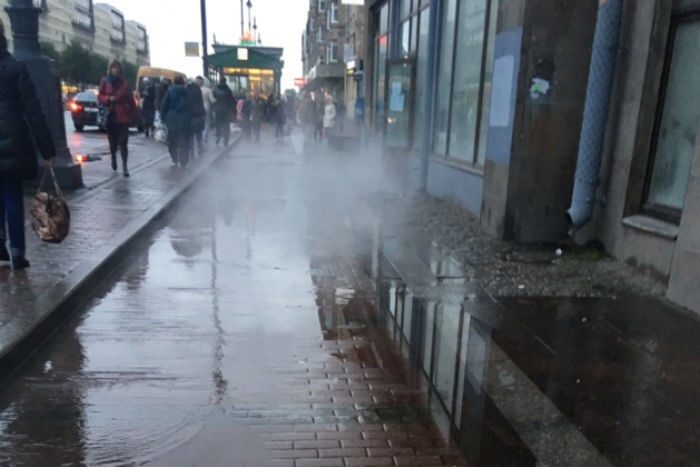 У станции метро «Московская» прорвало трубу с горячей водой. Кипяток вылился на тротуар. Фото опубликовали очевидцы 5 октября. По предварительным данным, пострадавших нет.