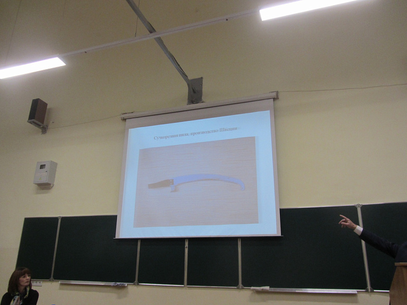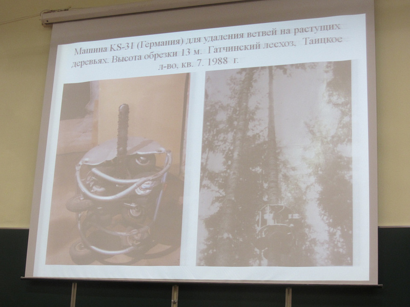 Сотрудник Санкт-Петербургской лесной академии поведал о проблемах выращивания качественной древесины, идущей на изготовление музыкальных инструментов. Главной проблемой здесь являются сучки, от которых необходимо как-то избавляться. Докладчик привел высказывание умирающего финского лесничего, на смертном одре сказавшего: «Я прощаю всех, кроме елового сучка». Далее рассказ перешел на инструменты для обрезки сучьев: от изогнутой шведской пилы до удивительного прибора, называющегося (буквально!) «лазающая обезьяна». Соответствующим образом настроенная и управляемая «обезьяна» сама забирается по стволу, обрезая сучья. Способна забираться на высоту до 13 метров. Стоимость такого машины превосходит стоимость автомобилей самых крутых марок! При этом такая машина вполне способна застрять на значительной высоте. В одном из таких случаев для спасения дорогостоящей техники пришлось привлекать воинскую часть. Представляю, как этот случай позабавил солдат!