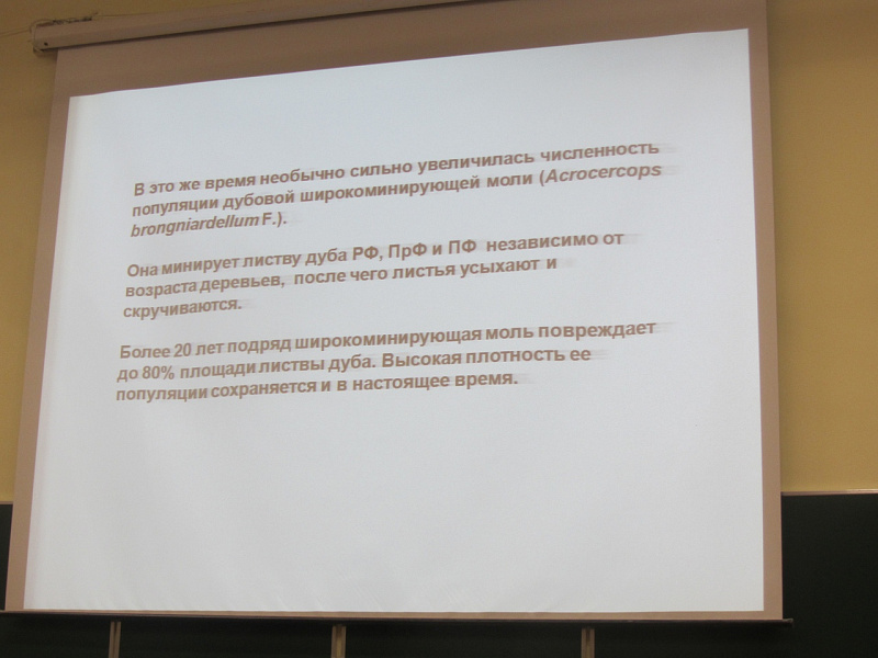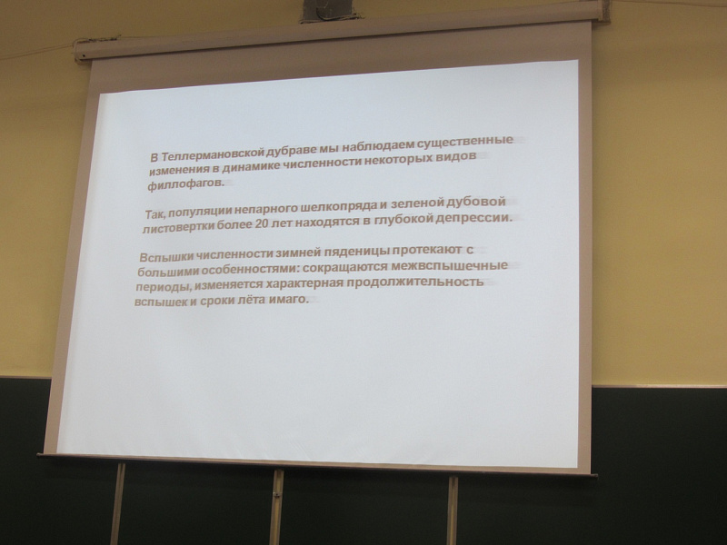 Представитель Института лесоведения Российской академии наук рассказал о динамике в экосистемах Теллермановской дубравы. Там увеличение среднегодовых температур вызвало практическое исчезновение таких вредителей как непарный шелкопряд, зеленая дубовая листовертка, зимняя пяденица при увеличении численности дубовой широкоминирующей моли и липовой моли — пестрянки. При этом сокращаются периоды между вспышками численности, изменяется продолжительность вспышек и сроки лета бабочек.