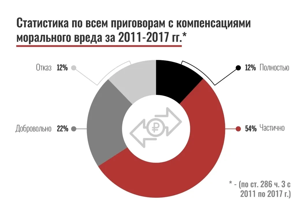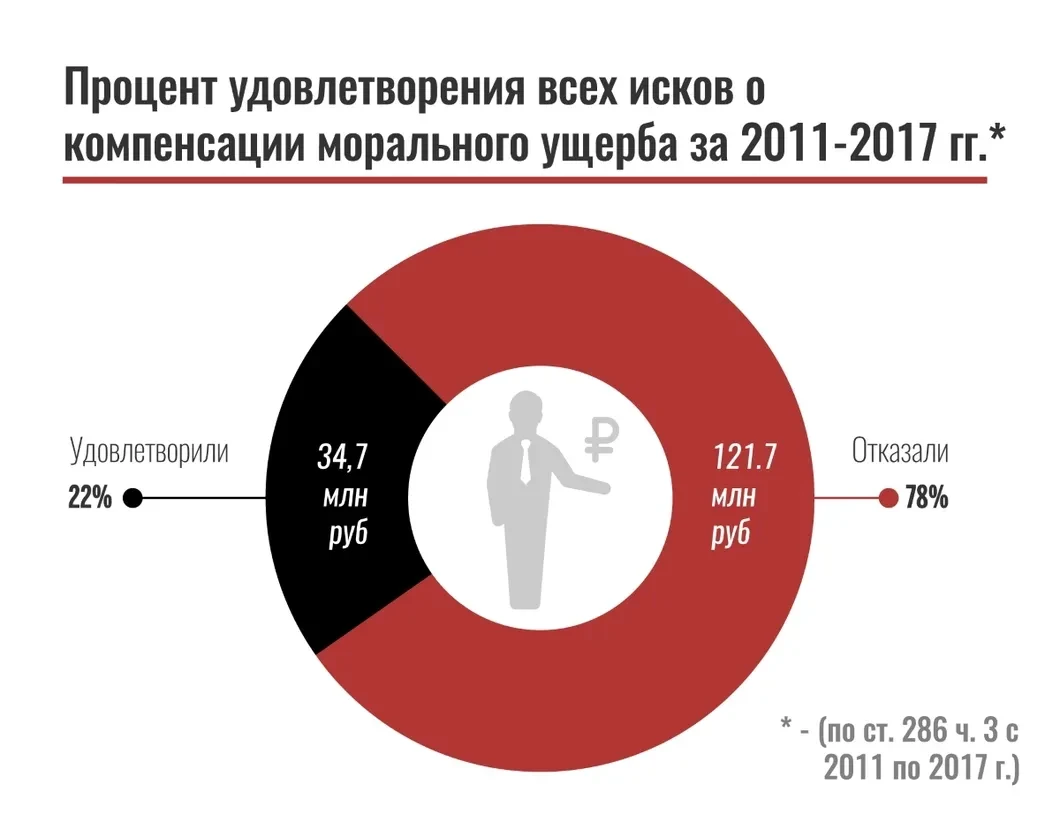 Согласно данным тех приговоров, где суммы исков в текстах раскрыты, за 7 лет из 156,4 млн рублей было выплачено 34,7 млн.