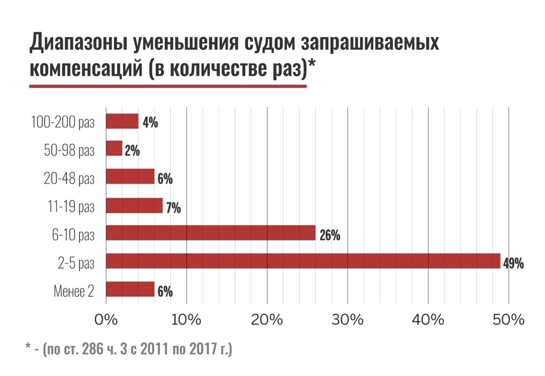 По нашим подсчетам, в 82% случаев удовлетворенных исков заявленная сумма в итоге была существенно снижена — от 2 до 200 раз.