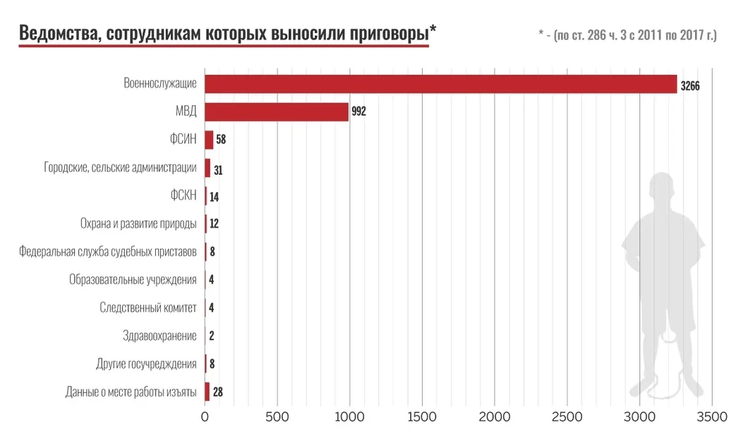 Всего, по данным судебного департамента, с 2011 по 2017 год в России по ч. 3 ст. 286 УК осудили 7116 человек. Как правило, если по делу проходило сразу несколько человек, то они работали в одном месте, поэтому мы смогли определить, сотрудникам каких ведомств чаще выносили приговоры.