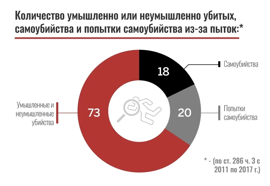 Под пытками, согласно Конвенции ООН, понимаются любые действия должностных лиц (полицейских, военнослужащих, сотрудников ФСИН и т.д.) с применением насилия, оружия или специальных средств. Это могут быть избиения, издевательства, причинение нравственных страданий или просто угроза применения насилия.В России нет специальной «пыточной» статьи для должностных лиц. Поэтому, когда дело доходит до суда, их обычно судят по части 3 ст. 286 Уголовного кодекса. Под эту же статью могут подпасть люди, по вине которых произошли, например, крупные аварии — такие случаи мы исключили из анализа.