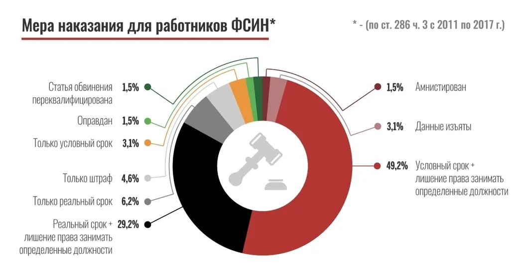 Сотрудникам ФСИН удается избежать реального заключения в половине случаев.
