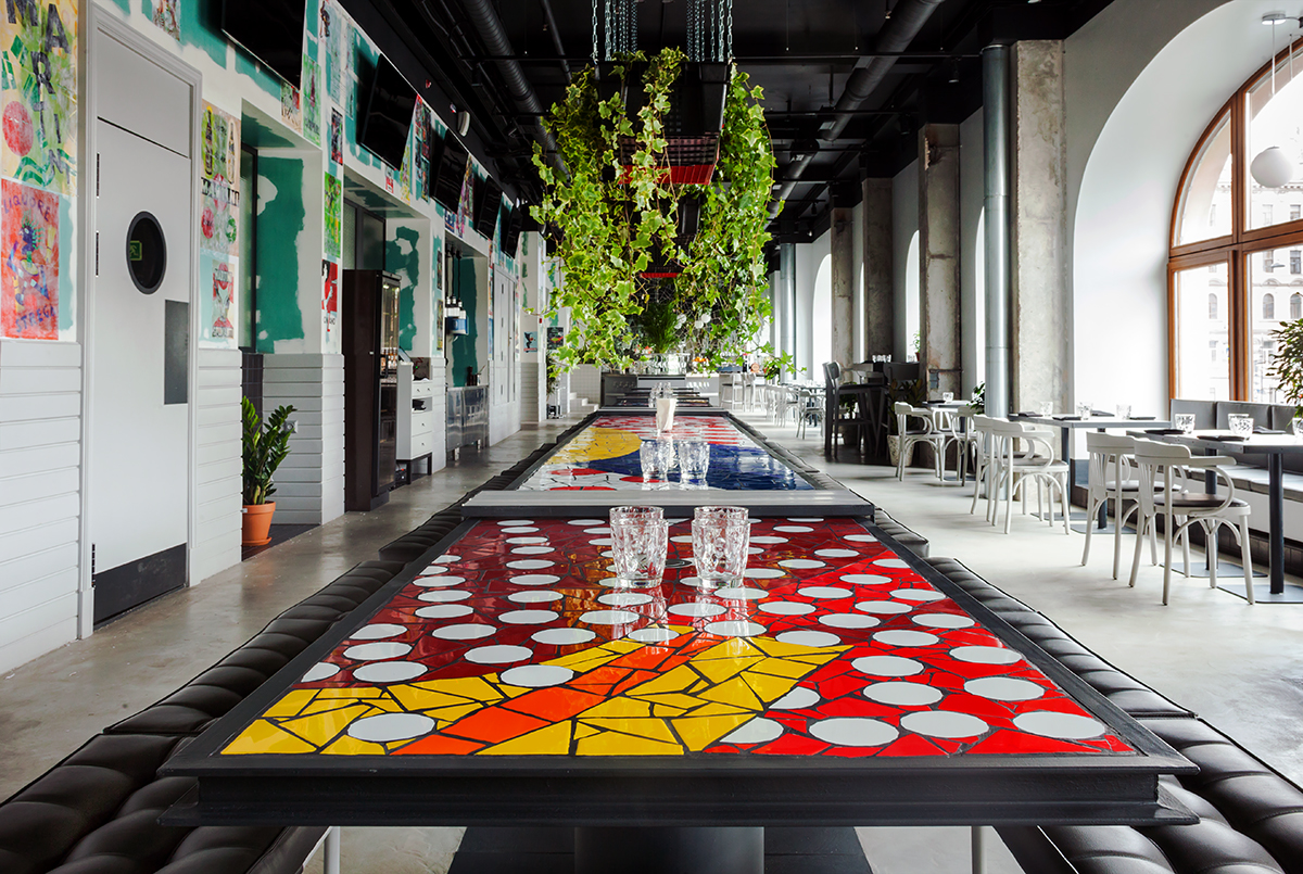 В ресторане на втором этаже есть открытая кухня и коммунальные столы с мозаикой. При приготовлении блюд шеф-повары ориентировались на современные итальянские рестораны в США и Лондоне.