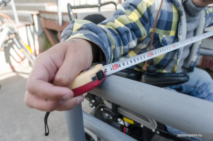 Илья Костин достает рулетку и первым делом измеряет высоту и ширину конструкции. По его словам, строители немного ошиблись: высота конструкции на пять сантиметров меньше положенного. Но это, отмечает он, не критично. Услышав первые замечания, директор рассказывает, что перед началом строительства работники школы искусств согласовали проект с представителями местного общества инвалидов. Илья Костин говорит, что раньше похожие ситуации были повсеместно.