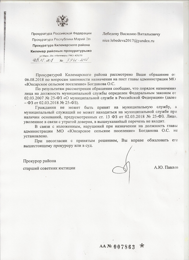 Сейчас я хочу вам предоставить ответ прокурора Килемарского района старшего советника юстиции Павлова Александра Юрьевича. Хочу задать один вопрос: зачем вы вообще добивались его увольнения, тратили время и деньги на «таскание» по судам, если через три месяца он, Богданов О.С., опять занял эту же должность? Павлов А.Ю, для кого вы вообще делаете этот цирк? Вы добились увольнения этого чиновника лишь для «пиара» ?