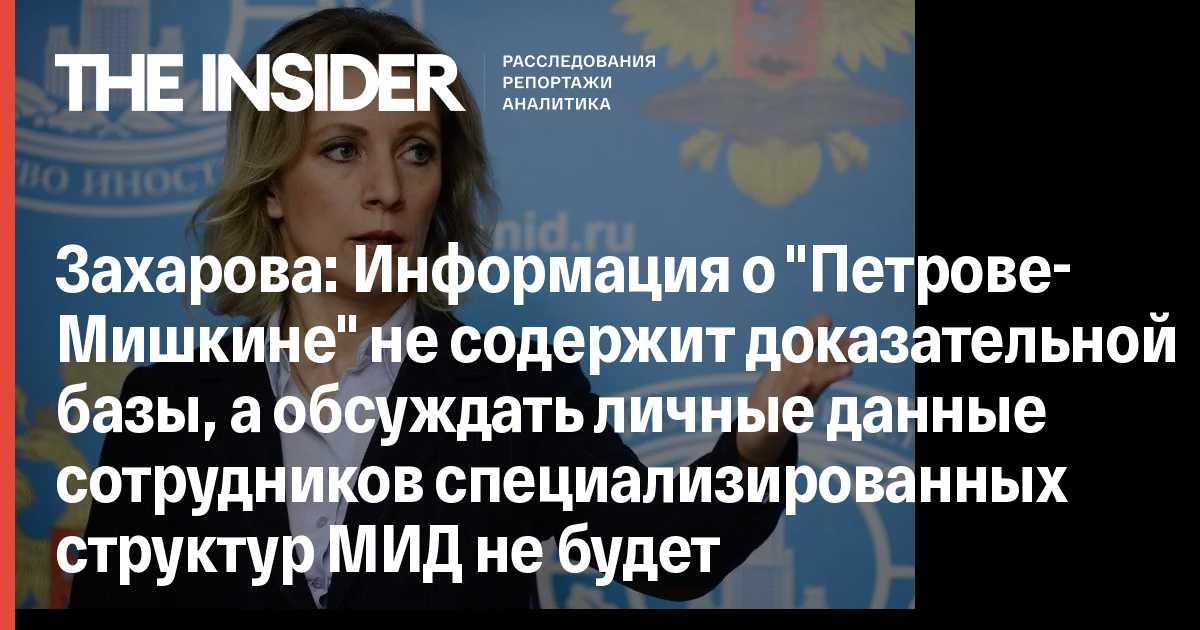 Информация о настоящем имени второго обвиняемого в отравлении Скрипалей «Александр Петрова», опубликованная The Insider и Bellingcat, не содержит доказательной базы, а личные данные россиян, высланных из Нидерландов по обвинению в кибершпионаже, МИД «не считает возможным обсуждать». Об этом The Insider заявила официальный представитель Министерства иностранных дел РФ Мария Захарова.
