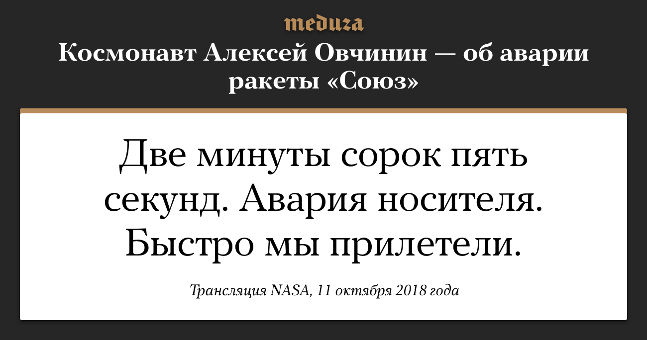 11 октября на корабле «Союз МС-10», направлявшемся к МКС, произошла авария. У ракеты-носителя отключились двигатели второй ступени. На борту находились российский космонавт Алексей Овчинин и астронавт NASA Ник Хейг. На трансляции запуска «Союза», которую опубликовало NASA, после аварии слышны слова Овчинина «Быстро мы прилетели». Космонавт говорит, что авария ракеты-носителя произошла через две минуты сорок пять секунд после запуска. Ранее такое же время указало РИА Новости. «Интерфакс» сообщал, что авария случилась через минуту пятьдесят девять секунд после запуска