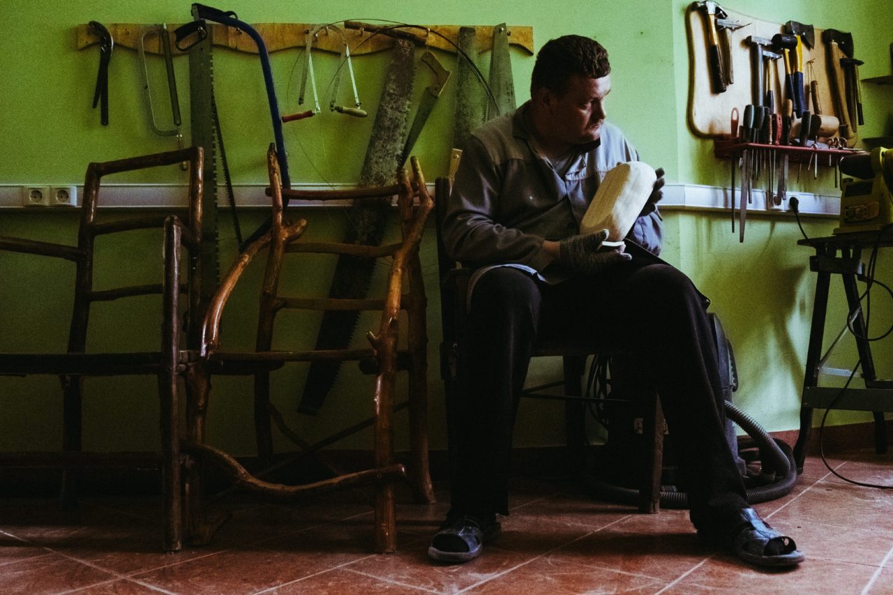 Андрей в столярной мастерской, он также работает в керамический мастерской, но в последнее время ему нравится работать с деревомФото: Мария Ионова-Грибина для ТД Когда может, Татьяна везде ходит с сыном. Но это часто утомительно, поэтому в дни, когда Андрей в «Турмалине», она может хоть чуть-чуть расслабиться, а он заняться любимой работой. Раньше Андрей делал керамику, любил крупные формы — большие вазы, тарелки, кувшины. А полгода назад попросился в столярную мастерскую. Теперь занимается деревом, с такой же страстью.