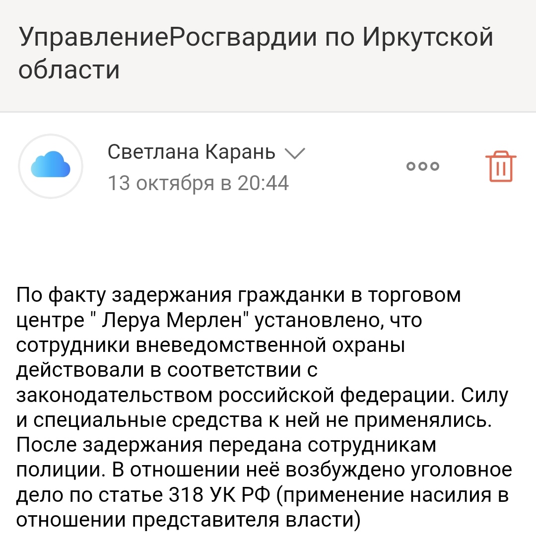 28 сентября Ирина и Иван, жители Иркутска, отправились в местный "Леруа Мерлен" за покупками. На выходе из магазина их обвинили в краже лампочки стоимостью примерно 100 рублей. Задержав покупателей, охранники предложила им выбор – оплату "похищенного" в пятикратном размере либо вызов полиции. Разговор шел на повышенных тонах и привлек внимание сотрудника Росгвардии, который имел при себе полный набор "спецсредств" (наручники, газовый баллончик) и с энтузиазмом начал их применять, когда Ирина заявила, что не поедет в полицию.