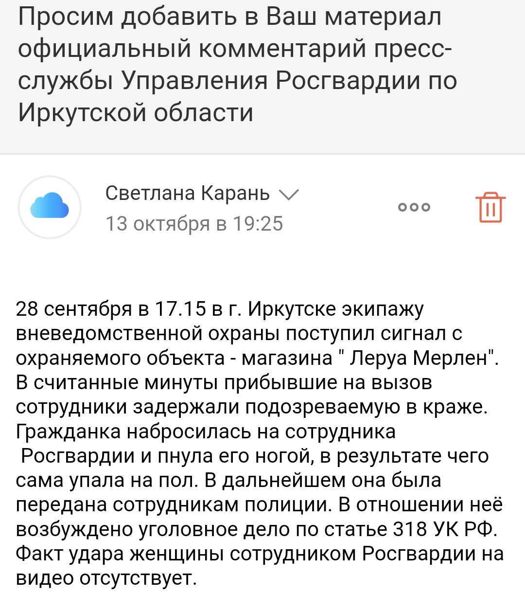 Официальные иркутские СМИ не проявили интереса к этой истории. О происшествии в "Леруа Мерлен" рассказал только правозащитный сайт pravoirk.ru. Редактор сайта, правозащитник Святослав Хроменков запросил комментарии в управлении Росгвардии в Иркутской области и получил ответ от сотрудника пресс-службы Светланы Карань: