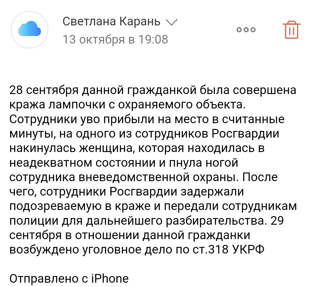 "28 сентября данной гражданкой была совершена кража лампочки с охраняемого объекта. Сотрудники уво (управление вневедомственной охраны. – С.Р.) прибыли на место в считанные минуты, на одного из сотрудников Росгвардии накинулась женщина, которая находилась в неадекватном состоянии и пнула ногой одного из сотрудников вневедомственной охраны. После чего сотрудники Росгвардии задержали подозреваемую в краже и передали сотрудникам полиции для дальнейшего разбирательства. 29 сентября в отношении данной гражданки возбуждено уголовное дело по ст. 318 УКРФ".