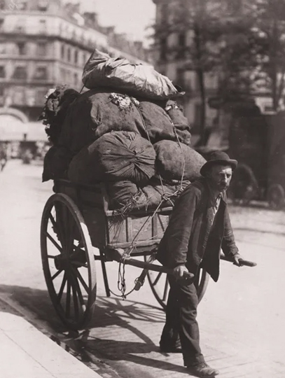 «Вот человек, в обязанности которого входит собирать дневные отбросы столицы. Все, что было извергнуто огромным городом, все, что было потеряно, выброшено, разбито, — все это он тщательно сортирует, собирает. Он роется в остатках развратных кутежей, в свалке всевозможной дряни. Он всматривается, производит искусный отбор; он собирает, как скупец, сокровища — всякие нечистоты, которые, вновь побывав между челюстями божественной Промышленности, станут предметами потребления или наслаждения».