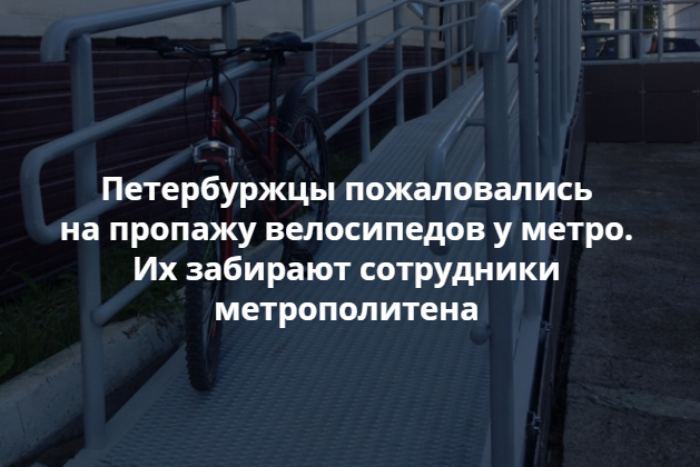 Петербургские велосипедисты пожаловались, что велосипеды, которые они оставили у метро, стали пропадать, написал «78». Издание рассказало, что в Петербурге велосипеды, которые пристегивают к перилам пандусов у вестибюлей, конфискует сам метрополитен. После этого сотрудники подземки выдают велосипед владельцу, когда он за ним приходит.