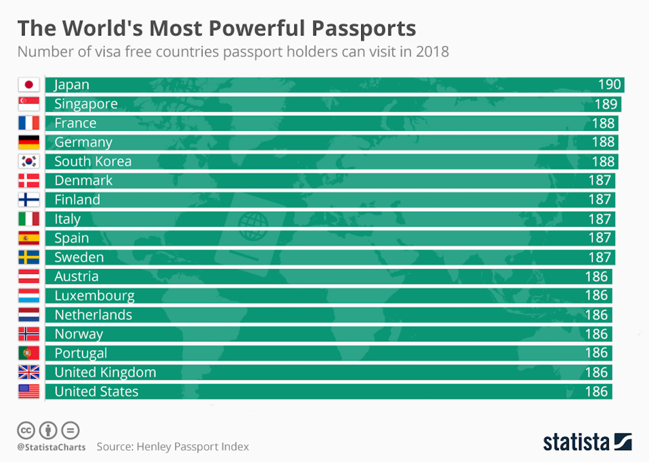 Паспорта одних стран дают больше возможностей для путешествий, чем других. Сейчас лидером рейтинга «самых мощных паспортов» является Япония — ее паспорт обеспечивает безвизовый въезд в 190 стран, следует из Henley Passport Index. Следом за ней вплотную идут Сингапур (189 стран), Франция, Германия и Южная Корея (у всех по 188 стран), Дания, Финляндия, Италия, Испания и Швеция (по 187 стран). У россиян возможностей для безвизовых поездок гораздо меньше — российский паспорт занимает 47-ю строчку рейтинга, с ним вы можете посетить 119 стран.