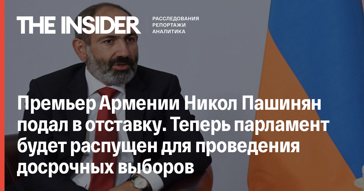 Премьер-министр Армении Никол Пашинян подал в отставку для дальнейшего роспуска парламента страны и проведения досрочных выборов, сообщает Reuters. Он подчеркнул, что отставка носит формальный характер.
