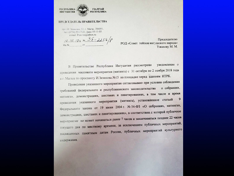 4 октября в Магасе объявили бессрочный митинг. Акции протеста сначала были несогласованными, но с 8 октября власти согласовали их. Правда, 13 октября ингушское правительство разрешило продлить митинг в Магасе на два дополнительных дня вместо десяти - на 16 и 17 октября, объяснив, что с 18 числа в республике должны пройти другие массовые мероприятия спортивного и культурного характера с участием делегатов из других регионов, в том числе из Москвы.