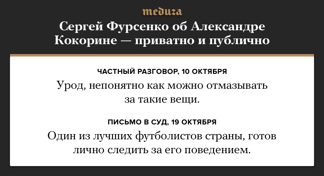 Президент «Зенита» Сергей Фурсенко 19 октября прислал в суд положительную характеристику на футболиста клуба Александра Кокорина и попросил отпустить его из-под ареста, так как он нужен клубу (суд это делать отказался). Несколькими днями ранее в разговоре с пранкерами, звонившими от лица Виталия Мутко, Фурсенко называл Кокорина и Павла Мамаева «самыми настоящими уродами».