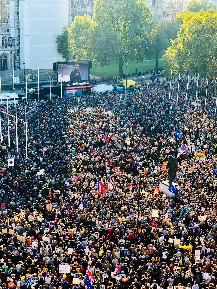 Увы, как и Хью Грант, который написал в своем Твиттере, что поддерживает идею, но не может лично присутствовать, а потому будет маршировать вокруг своей французской деревни и выкрикивать лозунги, я не смогла приехать в Лондон, но ходила с собаками вокруг своего поля, размахивая костылями и выкрикивая лозунги поддержки . Но и без нас с Хью людей в центре Лондона в субботу собралось достаточно. Это была одна из самых массовых демонстраций последнего времени, больше вышло людей только на шествие против войны в Ираке пятнадцать лет назад.