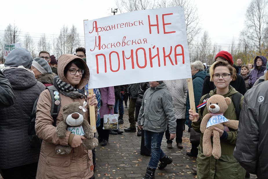 В Архангельске в 12:00 этого же дня у Соловецкого камня в парке имени Ломоносова активисты «Свободного севера» устроили пикет, в котором приняли участие около 50 человек. Они пришли с лозунгами «Наш север не для свалки», «Поморье не помойка», «Перед отставкой не надышишься».