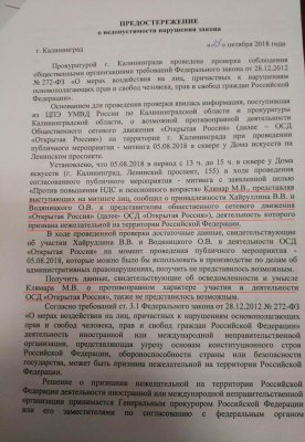 После этого в понедельник 22 октября Клямару пришло уведомление о возбуждении против него административного дела об участии в деятельности нежелательной организации (ст. 20.33 КоАП). На следующий день в прокуратуре закрыли дело, однако Клямару вручили предупреждение о недопустимости нарушения закона. В предупреждении сказано, что на митинге против повышения пенсионного возраста Клямар объявлял выступавших как представителей «Открытой России».