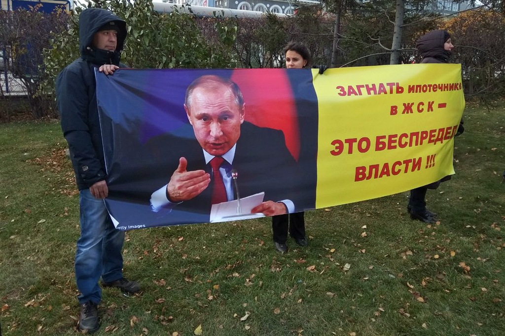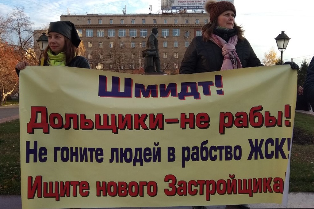На плакатах участников говорилось: «Загнать ипотечников в ЖСК — это беспредел власти», «Травников! Коноваловы в тюрьме, что дальше? Ждем предложений без ЖСК», «Шмидт! Дольщики — не рабы! Не гоните дольщиков в ЖСК!», «Бездействие властей превращает нас в бомжей».