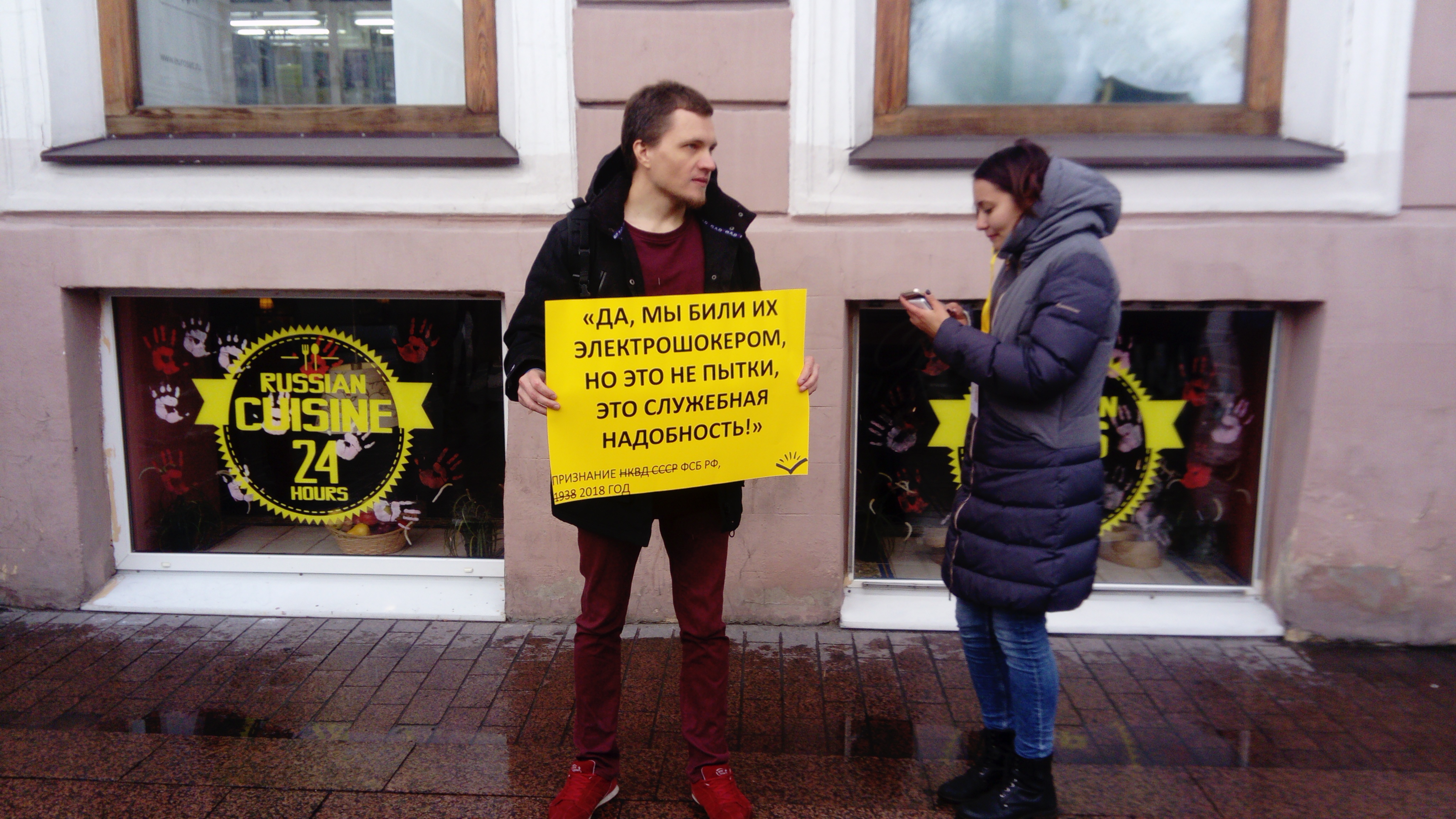 Акция проходила на Невском в районе Малой Садовой. Ранее власти Москвы и Петербурга не согласовали акции в поддержку фигурантов дел «Сети» и «Нового величия».