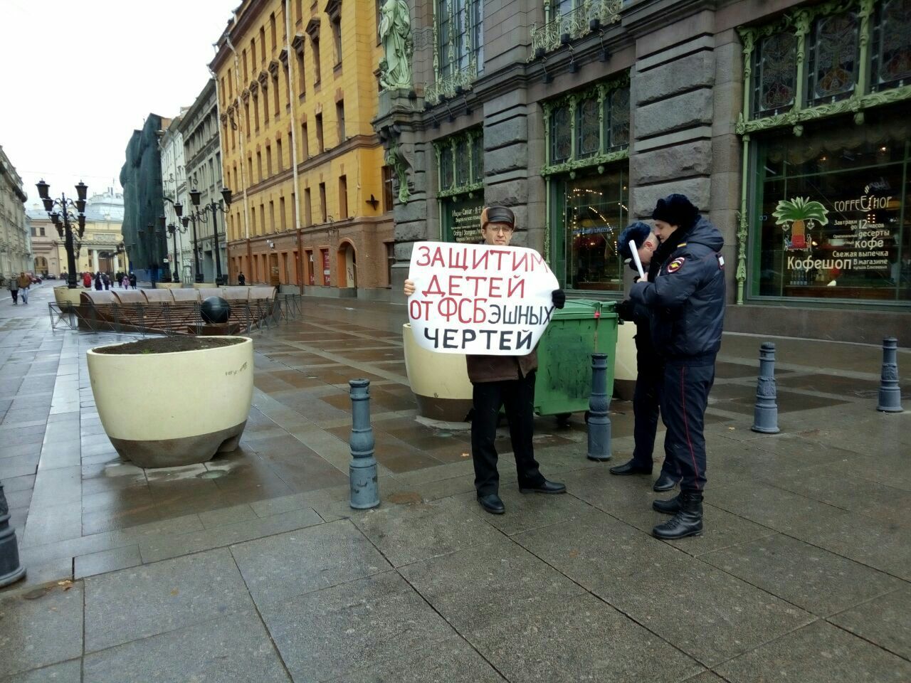 В телеграм-канале «Группы помощи задержанным» сообщили, что было задержано семь человек. Среди них был активист Дмитрий Скурихин: он стоял с плакатом «Защитите детей от ФСБшных чертей».