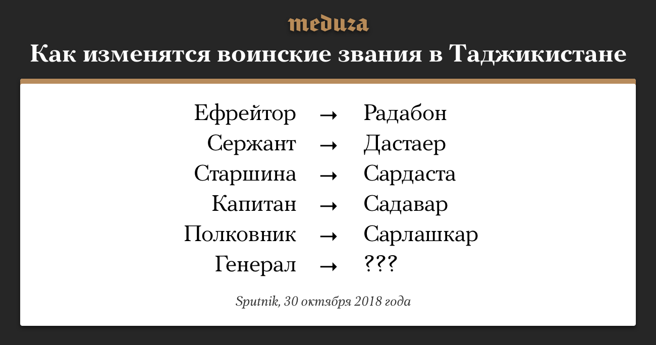 Власти Таджикистана решили заменить воинские звания, оставшиеся с советских времен. Для этого была создана специальная группа из ученых, историков и военных, которые изучали древние рукописи времен персидских династий Ахеменидов, Сасанидов и Саманидов. Комиссия предложила новые варианты всех званий за исключением высшего офицерского состава: специалисты не пришли к единому мнению относительно необходимости перевода на таджикский язык слова «генерал», которое одинаково звучит на многих языках мира.