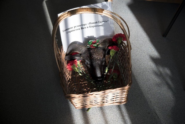 "Два дня подряд к зданию редакции приходят венки с угрозами в адрес одного из наших новых сотрудников, который еще даже к работе не приступил. Вчера – венок, сегодня – венок и отрезанная баранья голова, с угрозами", – рассказал Муратов 19 октября.